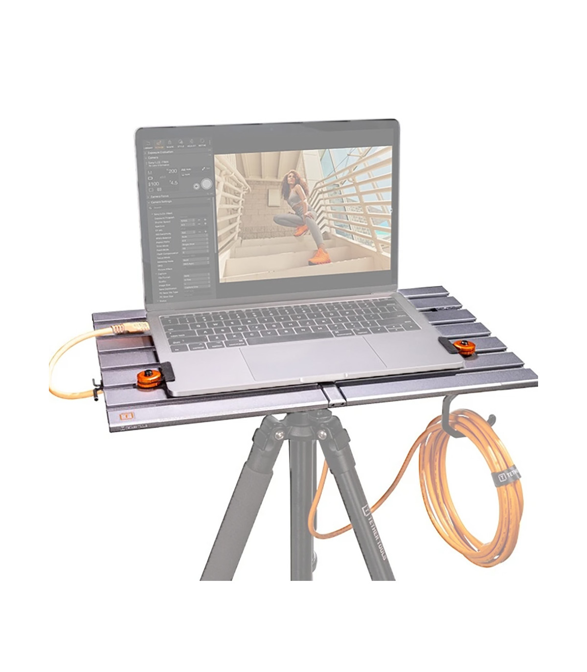 La promesse est tenue : fini le transport encombrant de plateaux en bois ou en métal monoblocs. L'AeroTrac se replie sur lui-même (format fermé : 22 x 28 cm). Arrivé sur le lieu de shoot, il se déploie en une surface de 43 x 28 cm, verrouillée magnétiquement, prête à accueillir votre ordinateur portable, vos disques de sauvegarde et vos outils de contrôle.